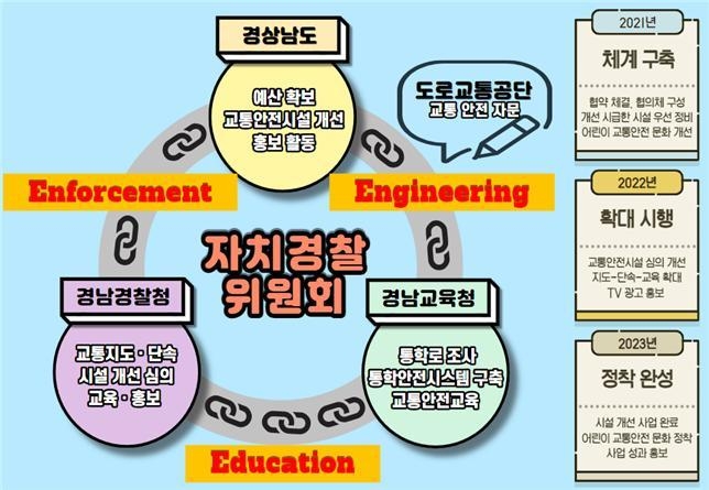 우리 위원회는 자치경찰 1호 사업 「집에서 학교까지 안전한 어린이 통학로 조성 사업」을 추진하고 있다. 경상남도자치경찰위원회-경상남도-경남경찰청-경남교육청-도로교통공단 등이 협업하며, 도내 어린이 교통사고 매년 10% 감소를 목표로 한다. 3개년 계획을 통해 어린이 통학로 시설 개선(2,379개소), 통학로 주변 법질서 확립(교통지도·법규위반 단속 강화), 어린이 교통안전문화 정착(교육·홍보 강화)을 중점 추진하고 있다.