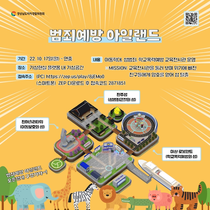 한편, 메타버스(네이버-ZEP 플랫폼)를 활용한 범죄예방 교육 「범죄예방 아일랜드」를 추진한다. 경남의 주요 명소를 컨셉으로 하여 친근감 있게 가상공간을 구성하였다. 사용자가 ‘아동보호의 섬’, ‘성범죄예방의 섬’, ‘학생보호의 섬’ 등으로 직접 아바타를 옮겨가며 교육자료를 열람·시청할 수 있다. 위원회는 교육청 등과 협의하여 교육자료로 활용할 수 있도록 할 방침이다. 10월 24일부터 11월 18일까지 「범죄예방 아일랜드」 홍보 이벤트를 진행한다.