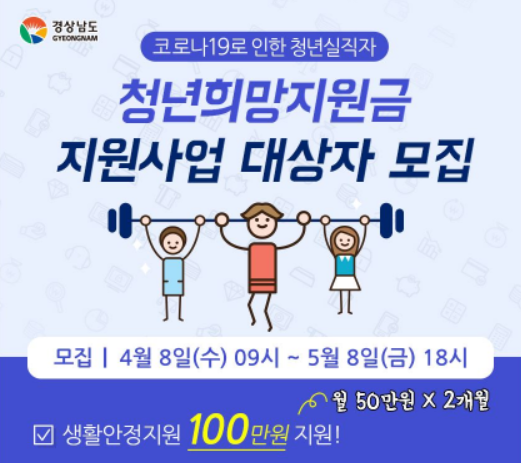 창녕군 청년희망지원금 지원대상은 총 40명으로 월 50만원씩 2개월 간 최대 100만원까지 지원하며, 코로나19로 침체된 지역상권을 살리기 위해 도내에서만 사용할 수 있는 기프트카드가 지급 될 예정이다.
