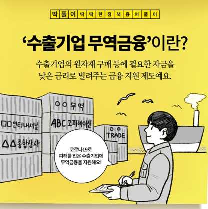 ‘수출기업 무역금융’이란 수출기업의 원자재 구매 등에 필요한 자금을 낮은 금리로 빌려주는 금융 지원 제도예요.