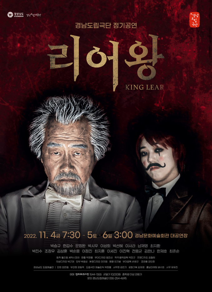 경남도립극단 정기공연 ‘리어왕’은 경남문화예술회관 대공연장에서 11월 4일(금) 오후 7시 30분 공연을 시작으로 5일(토)·6일(일) 오후 3시에 관객들을 만나며, 인터파크(ticket.interpark.com, 1544-1555)에서 예매할 수 있다.