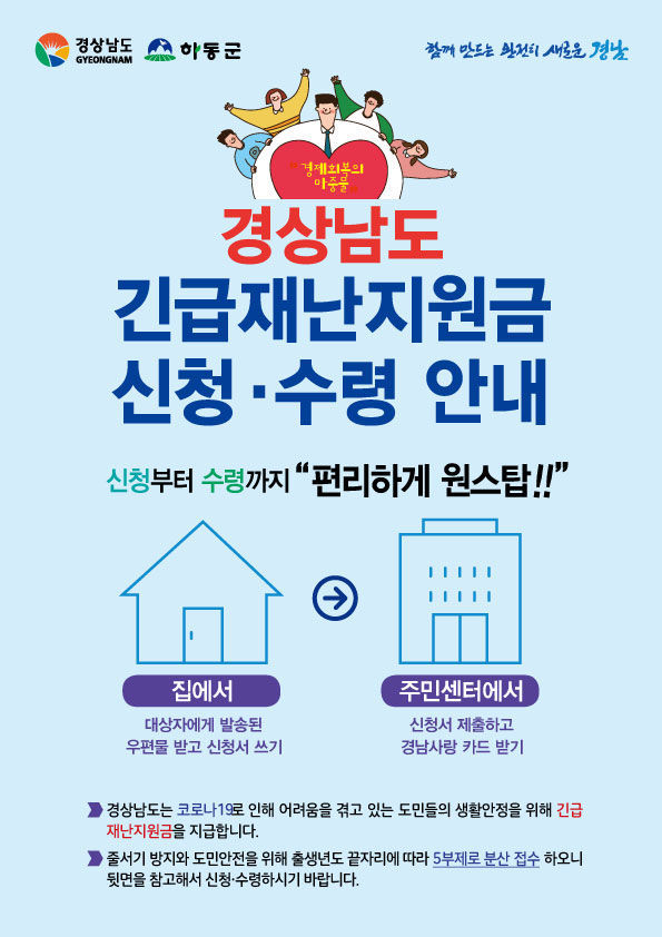 윤상기 군수는 “대상자는 별도의 신청 절차 없이 우편을 통해 개별 통지되고, 신청에서 카드 수령까지 모든 절차가 한 번에 이뤄진다”며 “경남 긴급재난지원금이 지역 민생 경제의 숨통을 틔우는 마중물이 되게 하겠다”고 말했다.