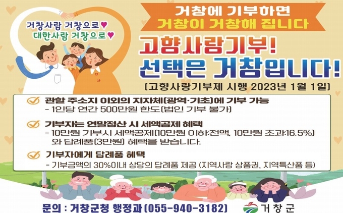 군은 「거창군 고향사랑기부금 모금 및 운용에 관한 조례」와 「거창군 고향사랑기부금 모금 및 운용에 관한 조례 시행규칙」을 만들어 11월 중 공포할 예정이며, 지난 9월부터 고향사랑기부에 대한 대군민 인식 확산을 위해 ‘거창사람 거창으로, 대한사람 거창으로! 고향사랑기부금 선택은 거창입니다’를 구호로 개발해 대표 홍보문구로 활용하여 리플릿, 배너, 홈페이지, 언론 기고문 등 다양한 방법으로 홍보하고 있다.
