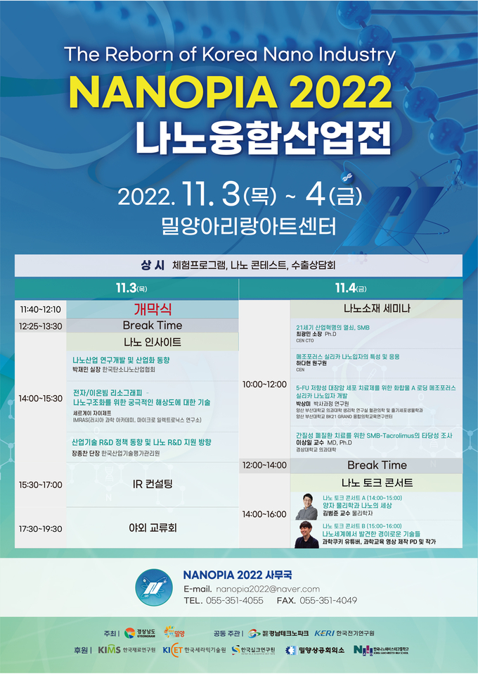 [경남도민뉴스] 경상남도(도지사 박완수)는 11월 3일부터 4일까지 밀양 아리랑아트센터에서 ‘대한민국 나노산업의 새로운 탄생’이라는 주제로 제9회 나노융합 산업전(나노피아 2022)을 개최한다.