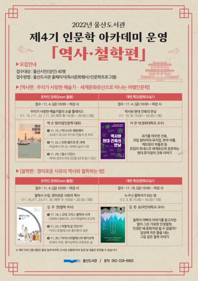 [경남도민뉴스] 울산도서관은 오는 11월 15일부터 12월 3일까지 ‘제4기 인문학 강좌(아카데미)–역사·철학편-’을 운영한다고 밝혔다.