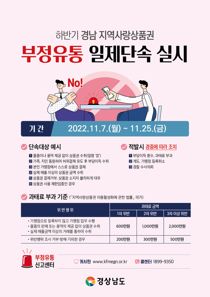 [경남도민뉴스] 거제시(시장 박종우)는 행정안전부의 전국 지역사랑상품권 부정유통 일제단속 추진에 따라 11월 7일부터 11월 25일까지 거제사랑상품권(이하 상품권) 부정유통 일제단속을 실시한다.