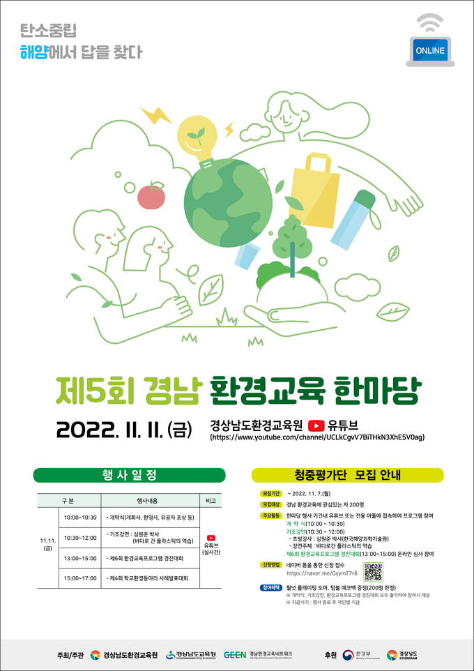 [경남도민뉴스] 경상남도 환경교육원은 오는 11일 10시부터 환경교육 기관 및 단체들의 정보 교류와 도민들의 환경 인식을 높이기 위한 ‘2022년 제5회 경남환경교육한마당’ 행사를 온라인으로 개최한다고 밝혔다.