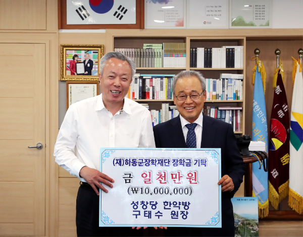(재)하동군장학재단(이사장 이양호)은 구태수 성창당 한약방 원장이 지난달 29일 군수 집무실을 찾아 후학양성에 써 달라며 장학기금 1000만원을 기탁했다고 1일 밝혔다.