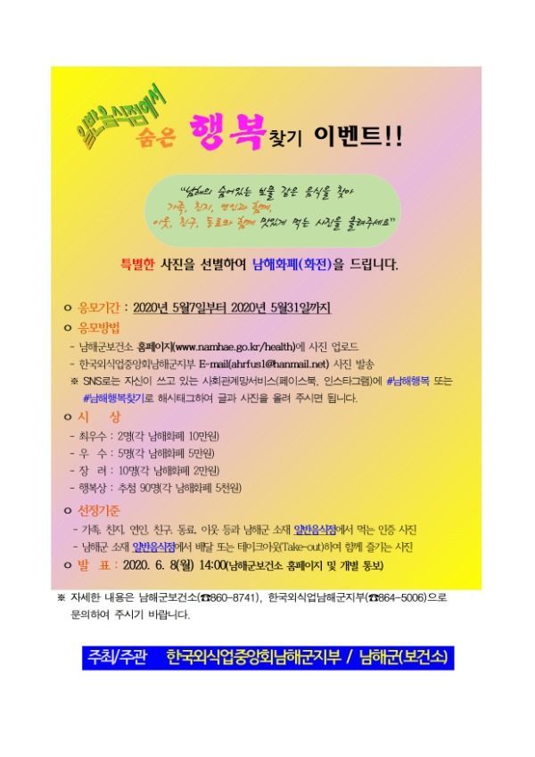 숨은 행복 찾기 이벤트와 관련한 자세한 사항은 남해군보건소(☎860-8741) 또는 한국외식업중앙회 남해군지부(☎864-5006)로 문의하면 된다.
