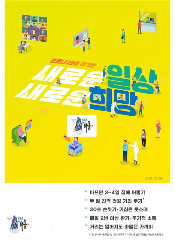 그리고 각종 시설 개방과 함께 △아프면 3~4일 집에서 머물기 △사람간 두 팔 간격 건강거리 두기 △30초 이상 손씻기 및 소매로 가리고 기침하기 △매일 2번 이상 환기 △거리는 멀어져도 마음은 가까이 등 군민이 지켜야 할 생활 속 거리두기 개인방역 5대 기본 수칙 실천을 홍보하고 있다.