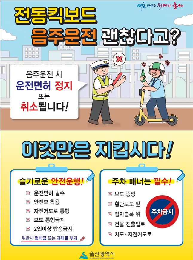 이에 울산시는 관내 주요 전광판 5개소와 구․군 행정복지센터, 보건소 등 시민 밀접 장소의 게시판을 활용하여 ‘전동킥보드 안전․이용수칙 준수 홍보 활동’을 집중적으로 펼친다.