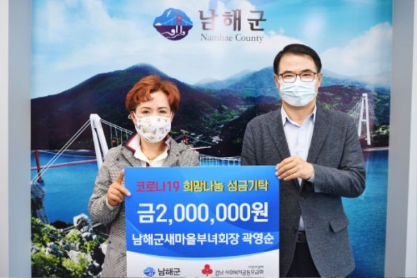 지난 12일 곽영순 남해군새마을부녀회장이 코로나19 사태가 또다시 불거지고 있는 상황에 확산 방지에 조금이나마 힘을 보태기 위해 성금 2백만원을 기탁했다.