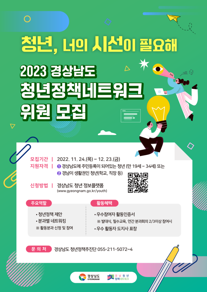 [경남도민뉴스] 경상남도는 2023 경남청년정책네트워크(이하 ‘경청넷’)에 참여할 청년들을 12월 23일(금)까지 모집한다고 밝혔다.