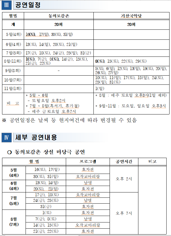 오는 16일 오후 2시 ‘효자전’을 첫 무대로 20회 공연을 진행할 예정이다. 5~6월은 토·일요일 오후2시, 7~8월은 금·토요일 오후 7시 공연이 열리며 날씨 등 현지여건에 따라 변경될 수 있다.