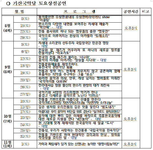 특히 지난해 상설공연 당시 많은 관람객들의 호응을 얻었던 대밭극장에서도 명창들의 소리 공연과 국악 앙상블 공연 등이 무대에 오른다.