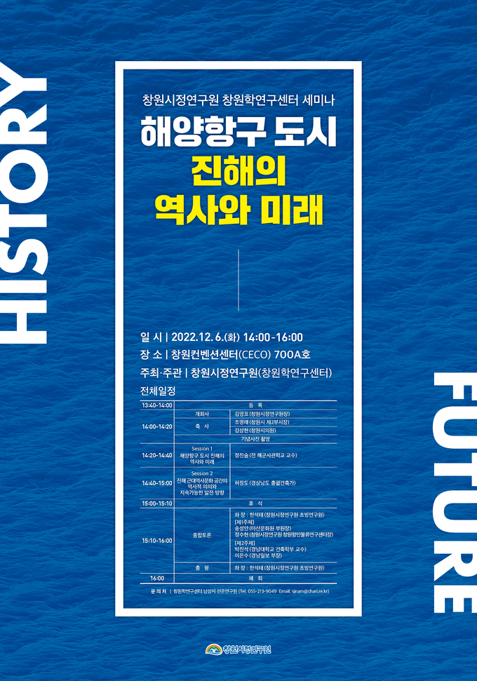 ‘해양항구 도시 진해의 역사와 미래’의 주제로 열리는 이번 세미나는 창원학연구센터의 첫 스토리북 「진해 근대역사문화광간의 재조명 – 공간, 기억을 잇다」와 지역사발굴연구 교양총서 「근대 문헌 속 진해」의 발간을 기념하고자 한다.
