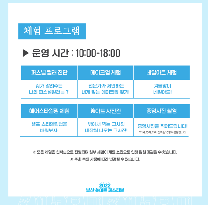 대면 행사로는 기존의 미용 분야 기능경진대회와 함께 부산미용을 직접 체험해 볼 수 있는 퍼스널컬러진단, 헤어쇼, 메이크업 체험, 미아트사진관 등 다양한 시민참여 프로그램이 준비됐으며, 미용대학 캡스톤 경진대회, 미용 분야 유명인(뷰티셀럽) 초청 강연, 멘토링 토크쇼 등도 진행된다.