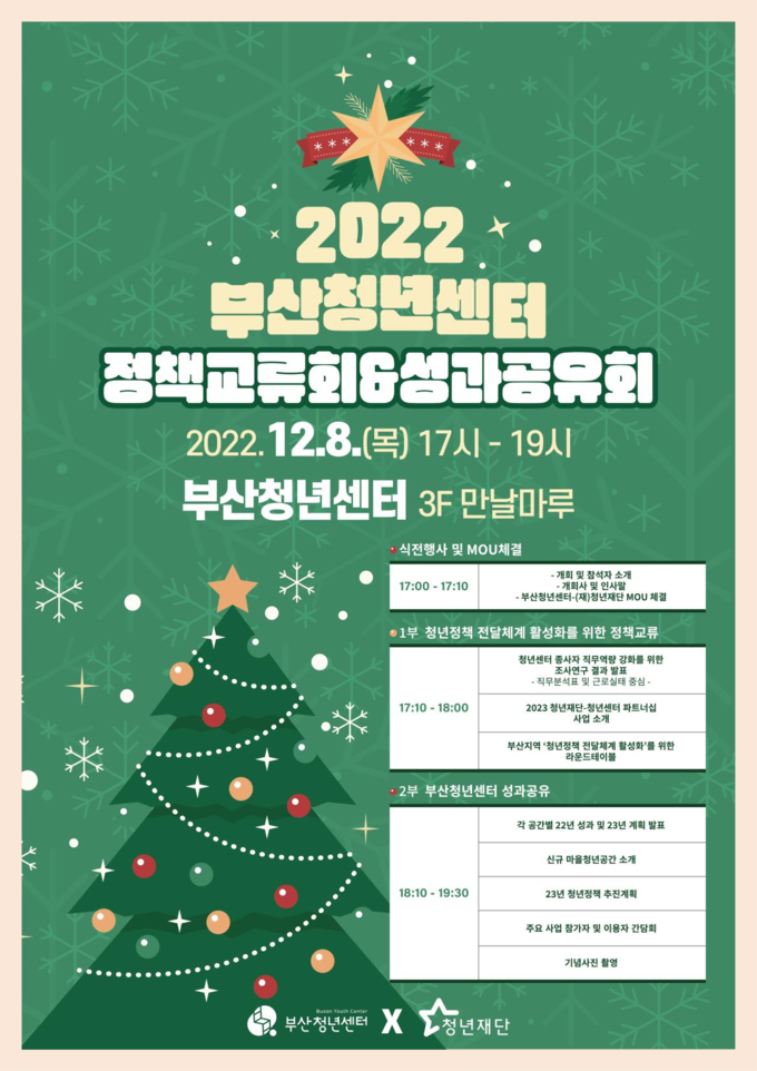 2부에서는 부산시 주요 청년 공간인 부산청년센터, 청년두드림센터, 청년작당소, 청년마루(부산진구)의 2022년도 운영성과를 공유하고, 주요 사업 참여자와 일반 청년들이 모여 2022년 한 해를 마무리하며 부산청년정책이 앞으로 나아가야 할 방향에 대해서 이야기 나누는 시간을 갖는다.