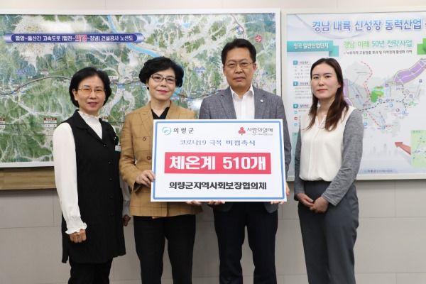 의령군지역사회보장협의체(민간위원장 정선남)는 지난 19일 의령군청을방문해 코로나19 극복을 위해 노력 중인 사회복지시설과 대민서비스 담당부서에 비접촉식 체온계 510개를 전달했다.