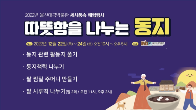 [경남도민뉴스] 울산대곡박물관은 동지를 맞아 12월 22일부터 12월 24일까지 3일간 2022년 동지 세시풍속 체험행사 ‘따뜻함을 나누는 동지’를 마련한다고 밝혔다.