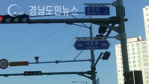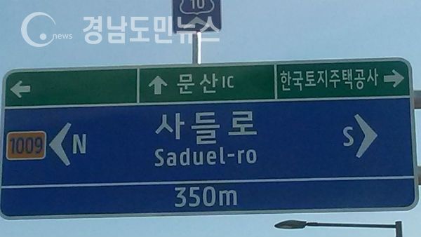 사진에서 보는 것처럼 도로 명 ‘사들로’의 표기가 일부 표지판은 'sadeul ro'로 일부 표지판은 ‘saduel ro'로 되어 있다.
