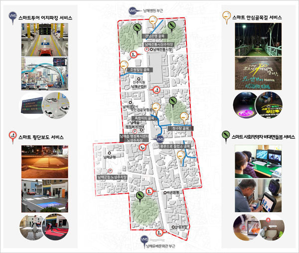 사업내용은 스마트투어 이지파킹 서비스, 스마트 횡단보도 서비스, 스마트 안심골목길 서비스, 스마트 사회적 약자 비대면 돌봄 서비스로 4가지 서비스를 스마트 통합플랫폼과 연계해 추진할 계획이다.