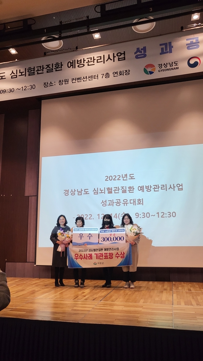 [경남도민뉴스] 거창군은 보건복지부와 경상남도가 주관하는 건강증진사업 분야 평가에서 금연클리닉 운영, 심뇌혈관질환 예방관리, 치매예방프로그램 총 3개 부문에 우수기관 표창을 수상했다.
