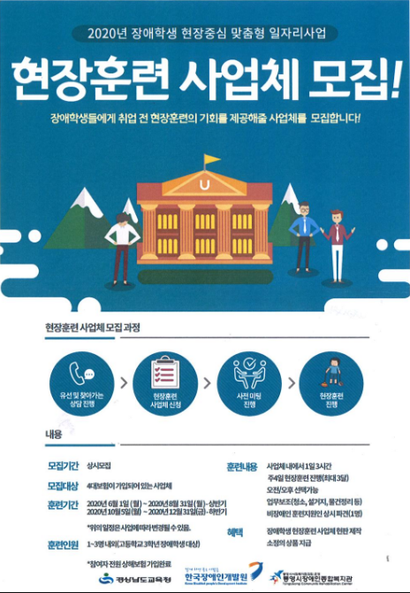 해당사업은 2020년 6월~12월까지(7개월 간) 진행되며, 통영시 관내 고등학교 3학년 장애학생 중 훈련생을 모집하여, 취업 전 지역사회의 현장훈련을 통해 자신의 적성과 진로를 확인한 후, 자신에게 맞는 취업을 할 수 있도록 지원해준다.