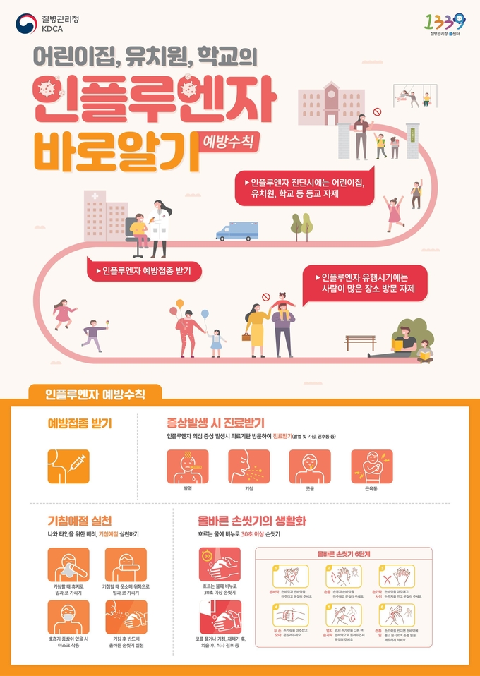 인플루엔자 의심증상이 나타날 경우에는 집단 내 전파를 예방하기 위해 가까운 의료기관에서 신속히 진료받아야 하며, 인플루엔자 진단을 받은 경우에는 해열제 없이 정상체온 회복 후 24시간까지 등원 또는 등교하지 않도록 학교와 학부모의 적극적인 협조가 필요하다.