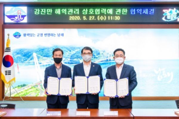 남해군은 27일 군청 회의실에서 장충남 군수, 국립수산과학원 남동해수산연구소 양정규 소장, 경상남도 수산안전기술원 노영학 원장 등 관계자들이 참석한 가운데 ‘강진만 해역관리 상호협력에 관한 업무협약’을 체결했다고 밝혔다.