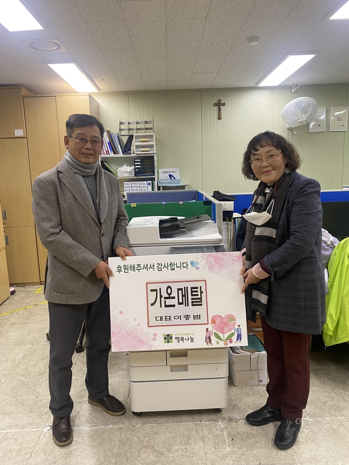 어려운 시기에 시설에 필요한 물품을 후원하신 가온메탈(대표 이종범)은 창원시 진해구 장애인 직업 재활 시설 '행복나눔(원장 박경옥)'에 복사기(300만원)를 후원했다.