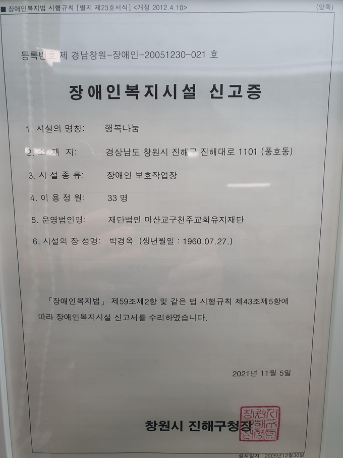 [경남도민뉴스] 장애인 직업재활시설 "행복나눔"은 창원시 진해구 진해대로 1101번지 진해장애인복지관내에 있는 장애인 근로 및 직업훈련 시설이다.