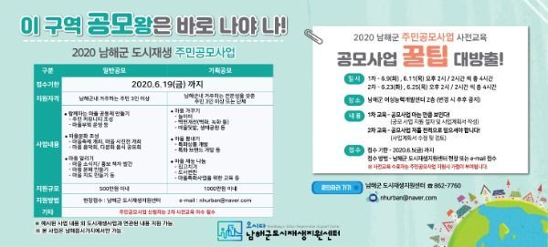 또한, 남해군은 지역주민의 사업참여 확대를 위해 사업참여를 희망하는 주민들을 대상으로 사업계획서 작성과 보조금 집행 및 정산방법을 알려주는 주민공모사업 사전교육을 6월 9일부터 25일까지 총 4회에 걸쳐 실시할 계획이다. 교육 참여를 원하는 팀이나 단체는 6월 5일까지 남해군 도시재생지원센터로 신청하면 된다.