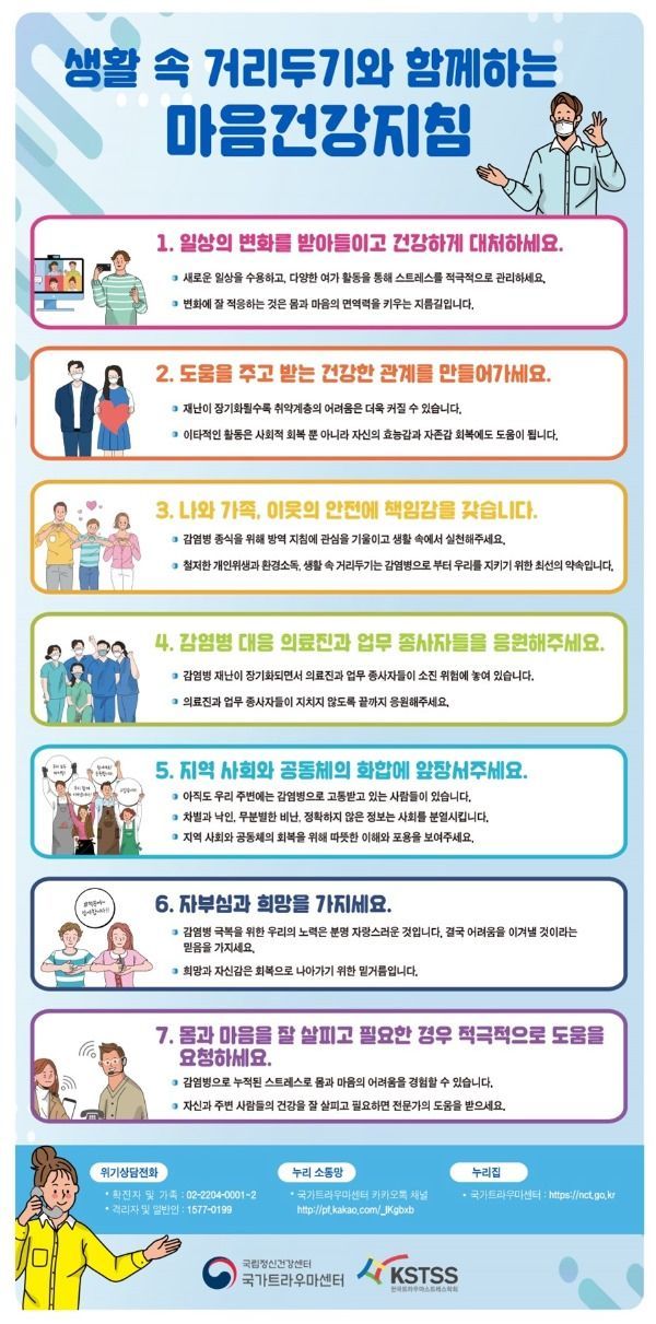 마음건강지침 7가지 메시지에는 변화된 일상을 받아들이고, 스스로가 안전에 책임감을 느껴 몸과 마음을 잘 살피고, 필요한 경우 적극적으로 도움을 요청할 것을 당부하는 내용을 담고 있다.