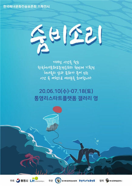 한국해녀문화전승보존회(회장 최영희)는 ‘숨비소리’를 주제로 가려진 시간을 찾는 첫번째 기획전을 연다. 삶과 문화가 묻어 있는 시간 속 여행으로 함께 떠나 보는 해녀 기획전이다. 해녀(공식 용어)에 대한 기록은 김진규(金鎭圭, 1658~1716)가 죽림포에서 1690년 여름에 전복을 캐는 남자 해녀의 모습과 생활상을 보고 ‘몰인설(沒人說)’이라는 글을 쓴 것이 우리나라 해녀(남자)에 대한 최초의 기록으로 보고 있다. 200여년 전 흑산도에서 ‘자산어보’를 쓴 정약전보다 약 100년 앞서 해남 잠수부의 해산물 채취 방법과 생활상을 기록한 것이다. 이학규(李學逵, 1770~1835)의 인수실집에 실린 기사 시 ‘채복녀’(採鰒女; 전복따는 여인)도 해녀에 관한 시이다. 이렇게 오랜 역사를 갖고 있는 해녀와 해녀문화에 대한 전시가 이제사 이루어진 것은 늦게나마 다행이며, 이 전시를 계기로 해녀문화가 세상에 널리 알려져서 통영지역의 대표적 콘텐츠로 자리매김하기를 기대해 본다.