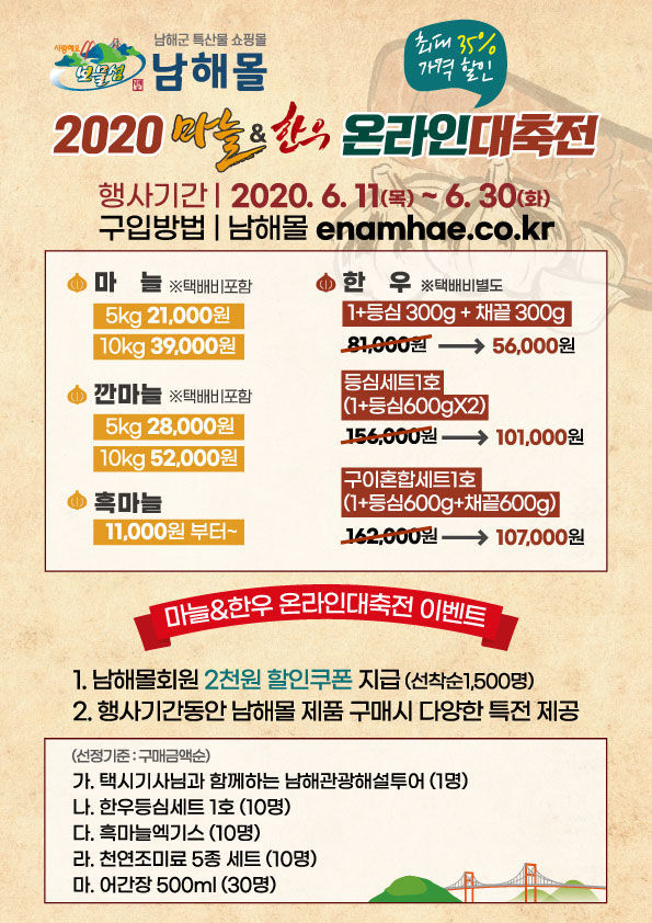 남해군이 이달 11일부터 30일까지 일정으로 ‘2020 마늘&한우 온라인 대축전’ 이벤트를 진행한다.