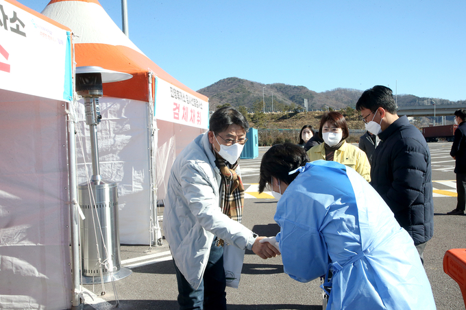 [경남도민뉴스] 홍태용 김해시장은 설 연휴 첫날인 21일 남해고속도로 진영휴게소(순천방향)에 차려진 임시선별검사소와 관내 선별진료소를 방문했다.