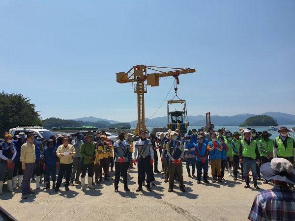 이날 참여자들은 4개의 조로 나누어 코로나19 생활 속 거리두기를 준수하며 도산면 도선리 칡섬끝부터 학섬일대에 버려진 플라스틱, 폐비닐, 폐스티로폼 부자를 집중수거하여 해양쓰레기 약3톤을 수거하고 폐뗏목 1척을 해체하는 작업을 진행했다.