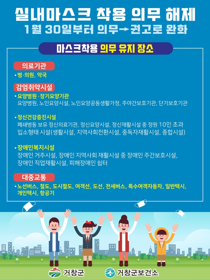 [경남도민뉴스] 거창군은 오는 30일부터 감염취약시설(장기요양기관 등), 의료기관, 약국, 대중교통수단 등을 제외하고 학교, 사무실, 식당, 카페, 헬스장 등 일상생활 대부분에서 실내마스크 착용 의무가 해제된다고 27일 밝혔다.