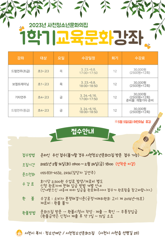[경남도민뉴스] 사천청소년문화의집은 관내 청소년을 대상으로 ‘2023년 1학기 교육문화강좌’ 참여자를 2월 14일부터 2월 24일까지 선착순으로 모집한다.