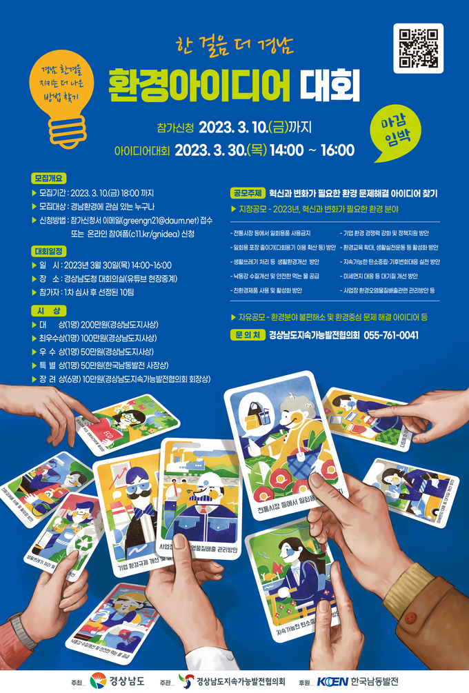 [경남도민뉴스] 경남도는 도민의 시각으로 생활 현장 속 다양한 환경문제 해결 아이디어를 찾기 위하여 ‘2023년 「한걸음 더 경남」 환경아이디어 대회’를 개최한다고 밝혔다.
