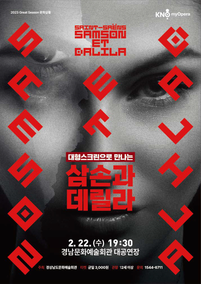 [경남도민뉴스] 경상남도문화예술회관은 오는 22일 오후 7시 30분 대공연장에서 국립오페라단의 마이오페라 삼손과 데릴라를 대형 스크린으로 선보인다.