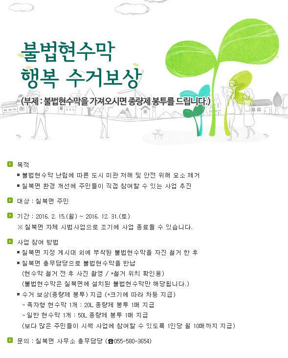 함안군 칠북면(면장 차종갑)은 불법현수막 난립을 방지하고 쾌적한 도시 미관을 조성하기 위한 ‘불법현수막 행복 수거보상 사업’을 시범 추진한다.
