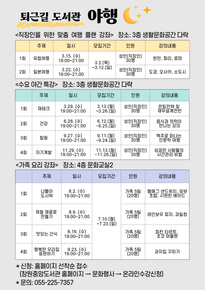[경남도민뉴스] 성산도서관과(과장 박경란)는 주간에 도서관을 이용하기 어려운 직장인 등을 대상으로 ‘직장인을 위한 맞춤 여행 플랜 강좌’, ‘수요 야간 특강’, ‘가족 요리 강좌’가 있는 『퇴근길 도서관 야행』을 운영한다.