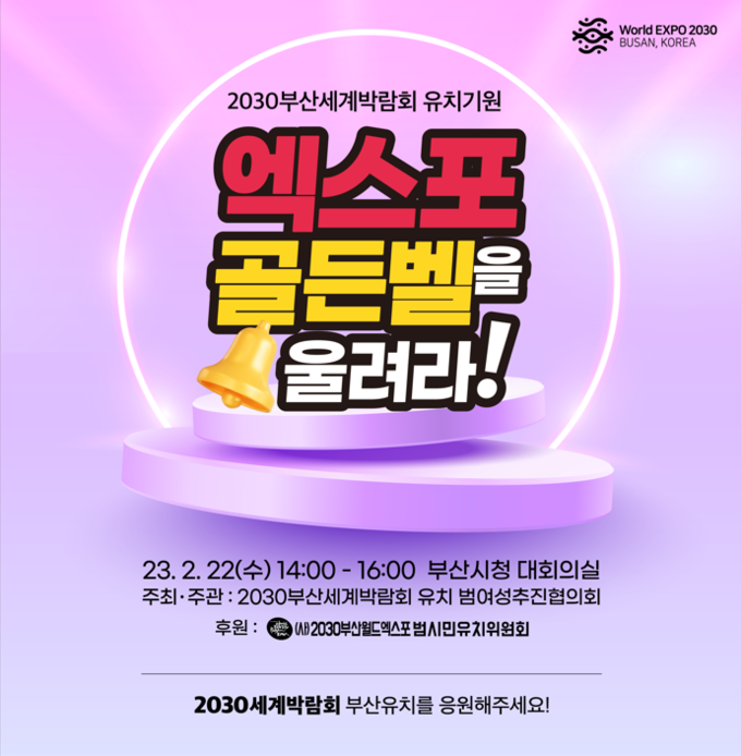 [경남도민뉴스] 부산시(시장 박형준)와 (사)2030부산월드엑스포범시민유치위원회(집행위원장 박은하, 이하 범시민유치위), 그리고 2030부산세계박람회유치범여성추진협의회(공동대표 김영숙 노선조 유순희 조규옥 천영희, 이하 범여성추진협의회)는 오는 22일 오후 2시 시청 1층 대회의실에서 <2030부산세계박람회 유치기원, 엑스포 골든벨을 울려라!> 시민 골든벨 대회를 개최한다고 밝혔다.
