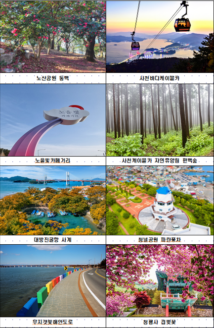 선호도 조사 대상은 ▲노산공원 동백 ▲노을빛카페거리 ▲대방진굴항 사계 ▲무지갯빛해안도로 ▲사천바다케이블카 ▲사천케이블카 자연휴양림 편백숲 ▲청널공원 파란풍차 ▲청룡사 겹벚꽃 등이다.