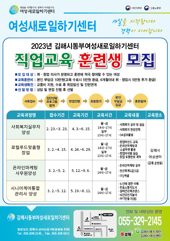 [경남도민뉴스] (재)김해시복지재단 김해시동부여성새로일하기센터(센터장 구정회)에서는 여성의 사회참여와 취·창업을 활성화하고 지역 사회 및 산업체 요구에 적합한 여성 인력을 양성하기 위해 2023년 여성 직업교육훈련생을 모집한다.