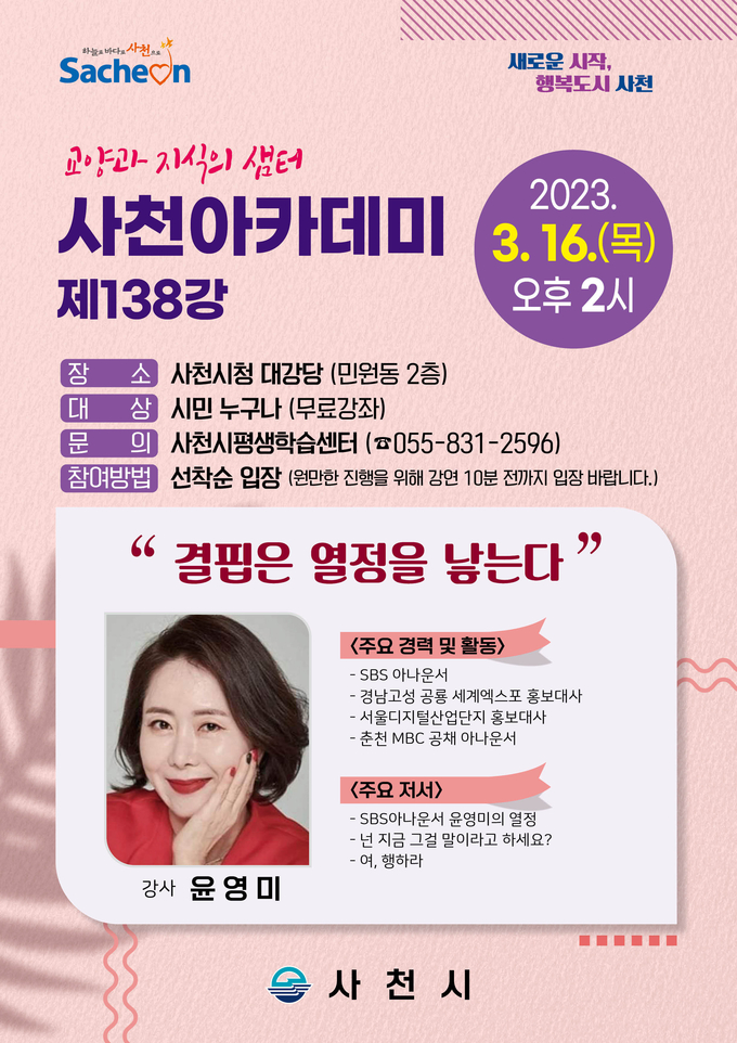 이번 사천아카데미 제138강은 지독한 열정으로 꿈을 이룬 똑 부러지는 말투로 대한민국을 사로잡은 윤영미 전 SBS 아나운서가 강사로 나선다.