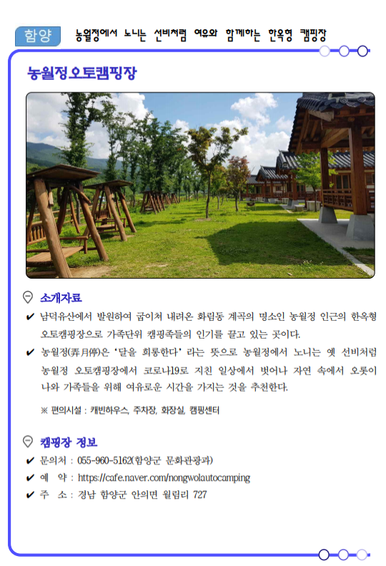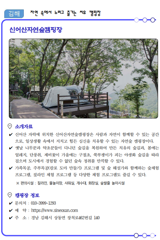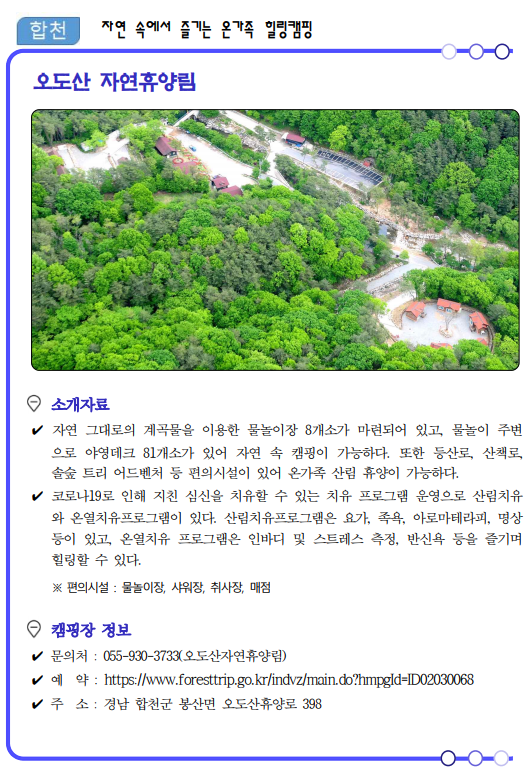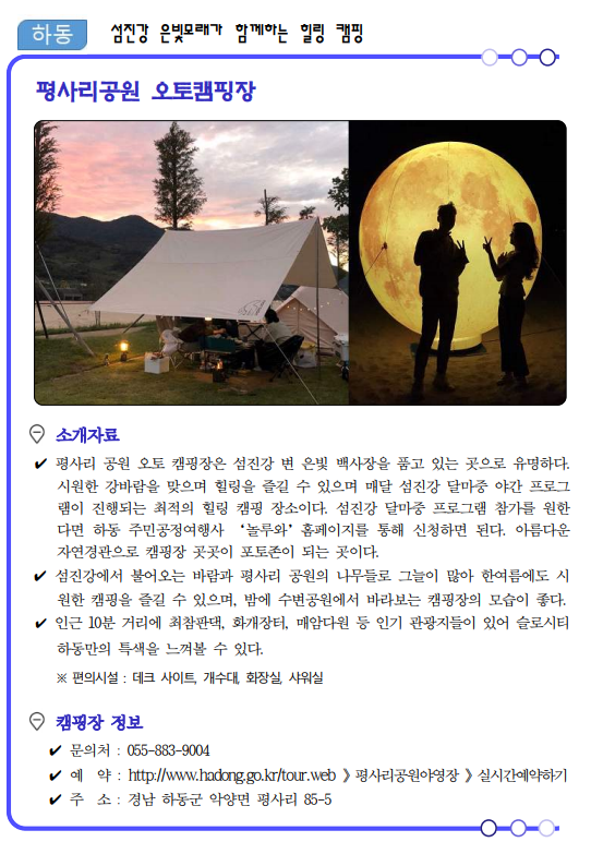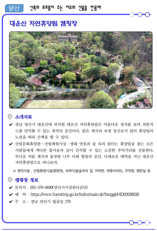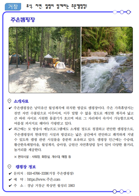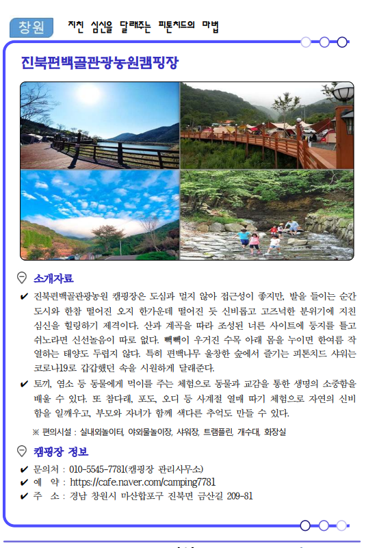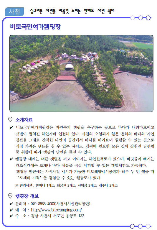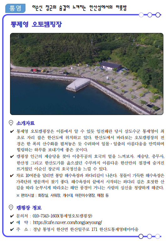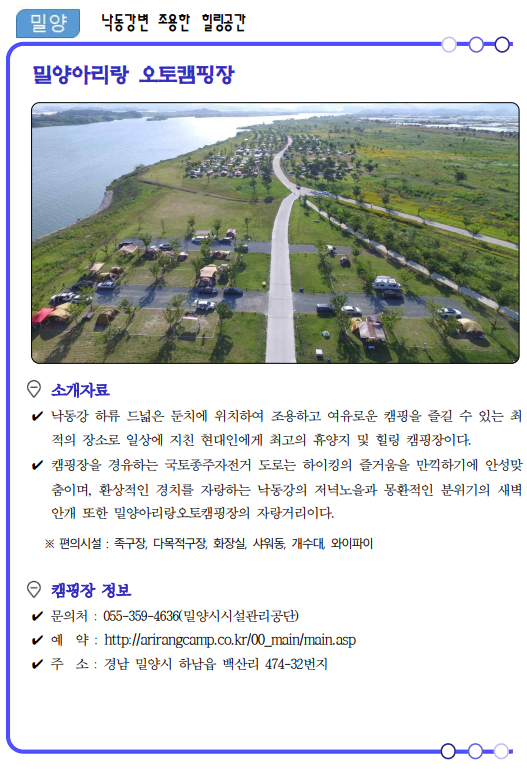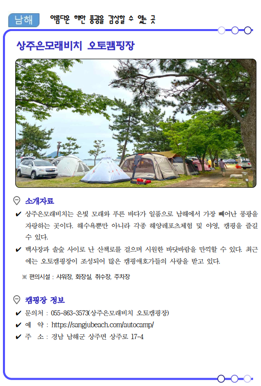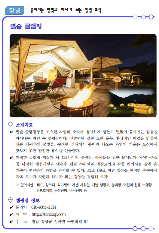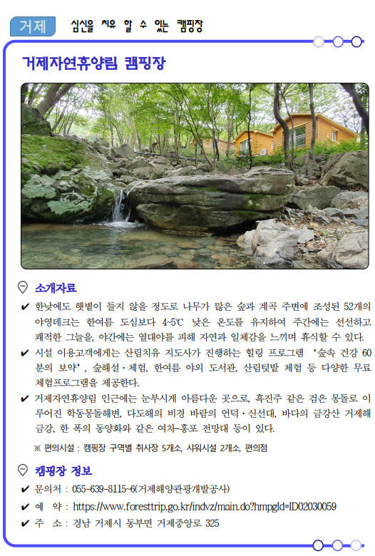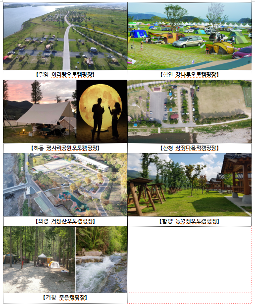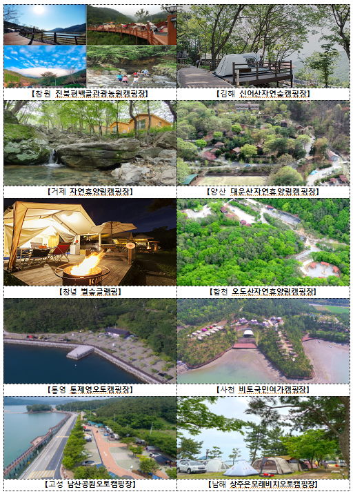 류명현 경남도 문화관광체육국장은 “코로나19가 관광의 모습도 많이 바꿔놓았고 비대면이 중요한 시기인 만큼 가족, 연인단위의 소규모 여행이 가능한 여름 캠핑장 17선을 선정‧소개하게 됐다”면서, “경남의 자연 속에서 코로나로 지친 심신을 치유해 가시길 바란다.”고 말했다.