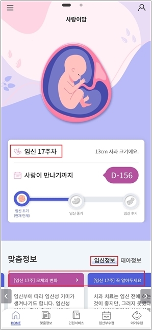 특히, 아이마중 모바일 앱 ‘맞춤정보’ 탭에서는 △임신 △출산 △영유아로 구분해 안내하고 있으며, 임신 맞춤정보에는 각 임신주수별로 태아의 성장, 모체의 변화, 산전 진찰 일정과 검사항목, 운동·약물 등과 관련된 일상생활 가이드 등이 있다.